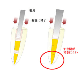 垂直加圧方式ですと「半固体」の状態で薬を詰め、また、垂直に薬を詰めていきますので、「隙間」が生じにくく、再感染リスクを低くすることができますので、当院では「垂直加圧方式」を採用しています。